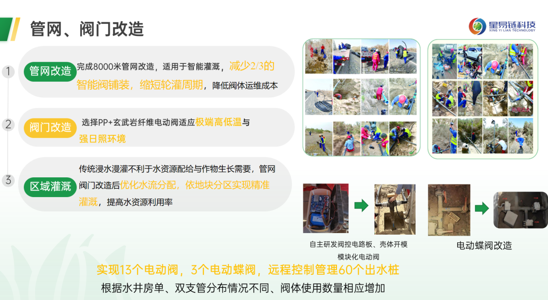 为了确保改造工程的顺利进行,星易链科技的技术团队经过1年7个月,1万小时的故障率测试(每个基站覆盖10km),还对市面上7套阀体反复试验和信号重置优化,解决方案也进行了科技查新,最终定制开发了最适合沙漠环境的智能电动阀产品以及首部一体机(已经迭代三代)。这些智能电动阀采用了先进的材料和工艺,具备防水、防尘、防沙的特性,能够在高温、低温不同的环境下稳定运行。